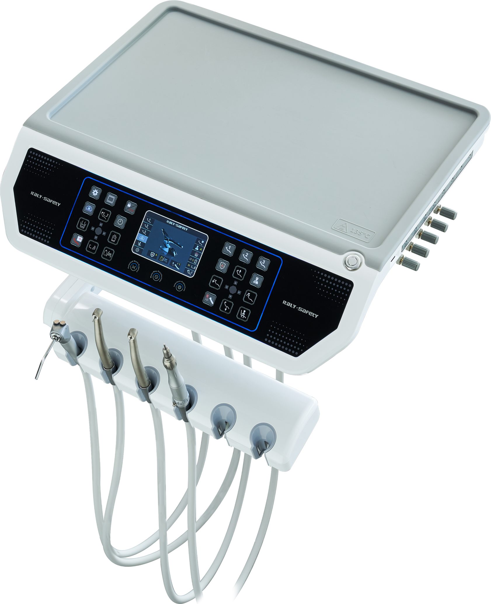 Three-joint joint arm with flexible rotation, larger position for four-hand operating area. Five instrument hangers (which can be rotated 90°) in the assistant tray, adaptable to the dual suction system, reserving built-in light curing machine hangers and endoscope handle hangers.