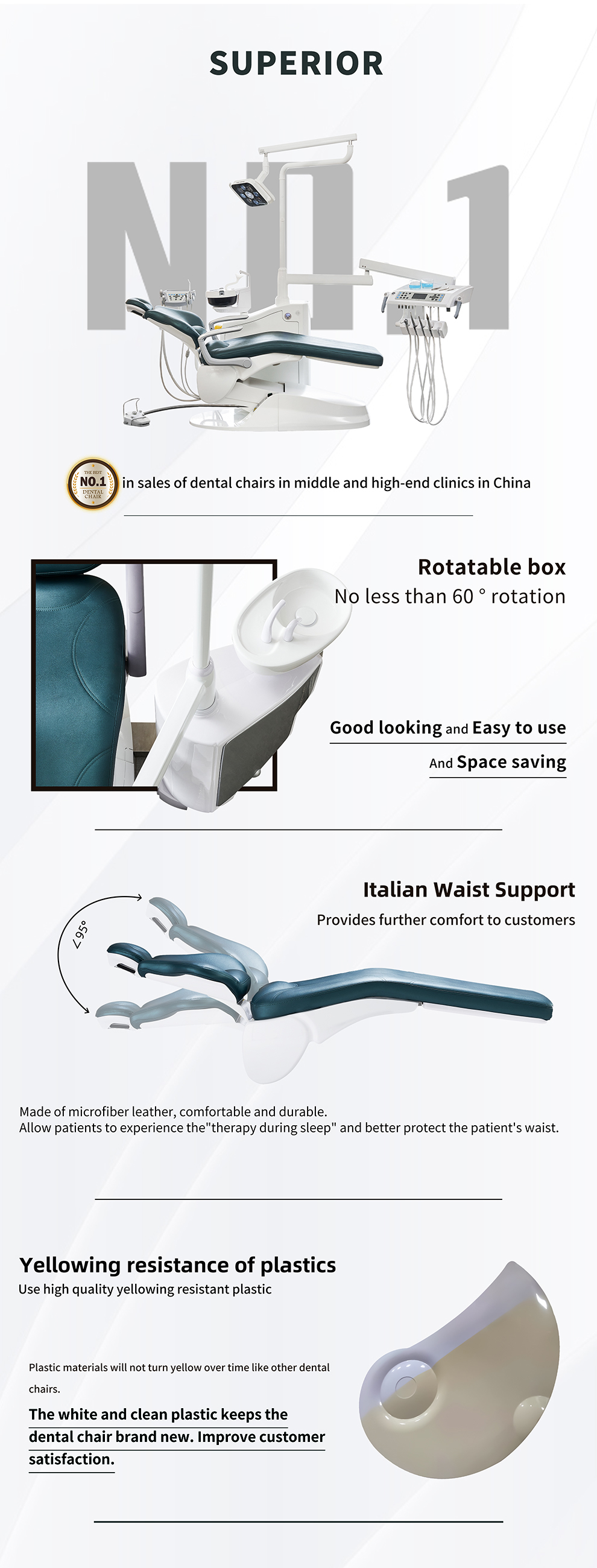 塑料耐黄变:采用优质耐黄变塑料。塑料材质不会像其他牙科椅一样随着时间的推移而变黄。洁白洁净的塑料使牙科椅保持崭新,提升客户满意度。